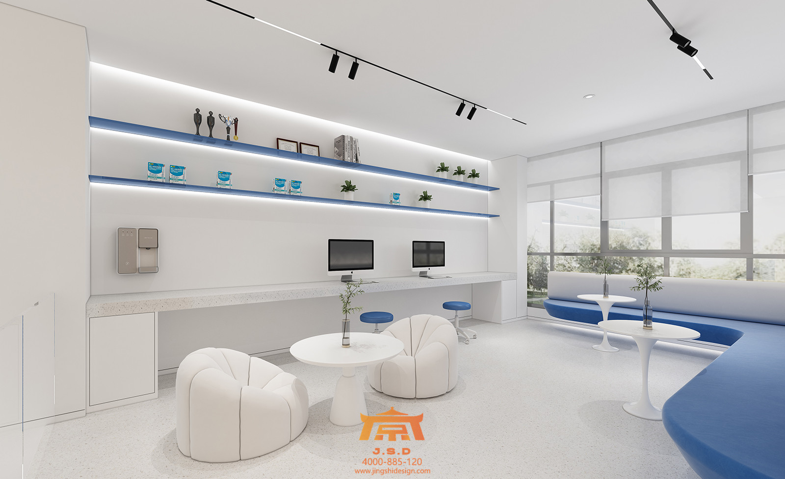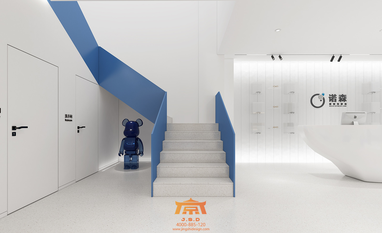 Nossen项目位于郑州,在中原地区快节奏的都市生活中,Meet Blue是一种从容态度,J·S·DESIGN设计师团队从未来的独特视角结合艺术感知力,创造出一个以商业医疗为主,预防治疗为辅的眼视光诊所空间。一个充满商业感与医疗碰撞的立体空间,可以很快与人在精神上产生共鸣。白色和蓝色是Nossen的颜色,也是眼视光诊所的颜色。搭配蓝色卡乐板镜架柜,让医疗的空间与顾客“对话”,楼梯处蓝色金属扶手链接一二层,立体动线和商业感延伸了整个空间,LED的灯光给空间赋予未来的氛围。白色乳胶漆墙面与地胶大面积的运用,让空间充满了包容力,这是对眼视光商业的一种解读。让人驻足思考,放心治疗,感受佩戴眼镜的时尚乐趣,墙面布艺沙发与大面积白色为反衬,空间在深浅对比中彰显消费性眼科医疗体验。